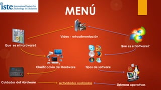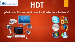 El documento explica la relación entre hardware y software, definiendo el hardware como los componentes tangibles de una computadora y clasificándolo en dispositivos de entrada, salida y almacenamiento. También describe el software como las instrucciones que permiten al hardware realizar tareas, y detalla los diferentes tipos de software, como sistemas operativos y aplicaciones. Además, incluye cuidados del hardware para prolongar su vida útil.