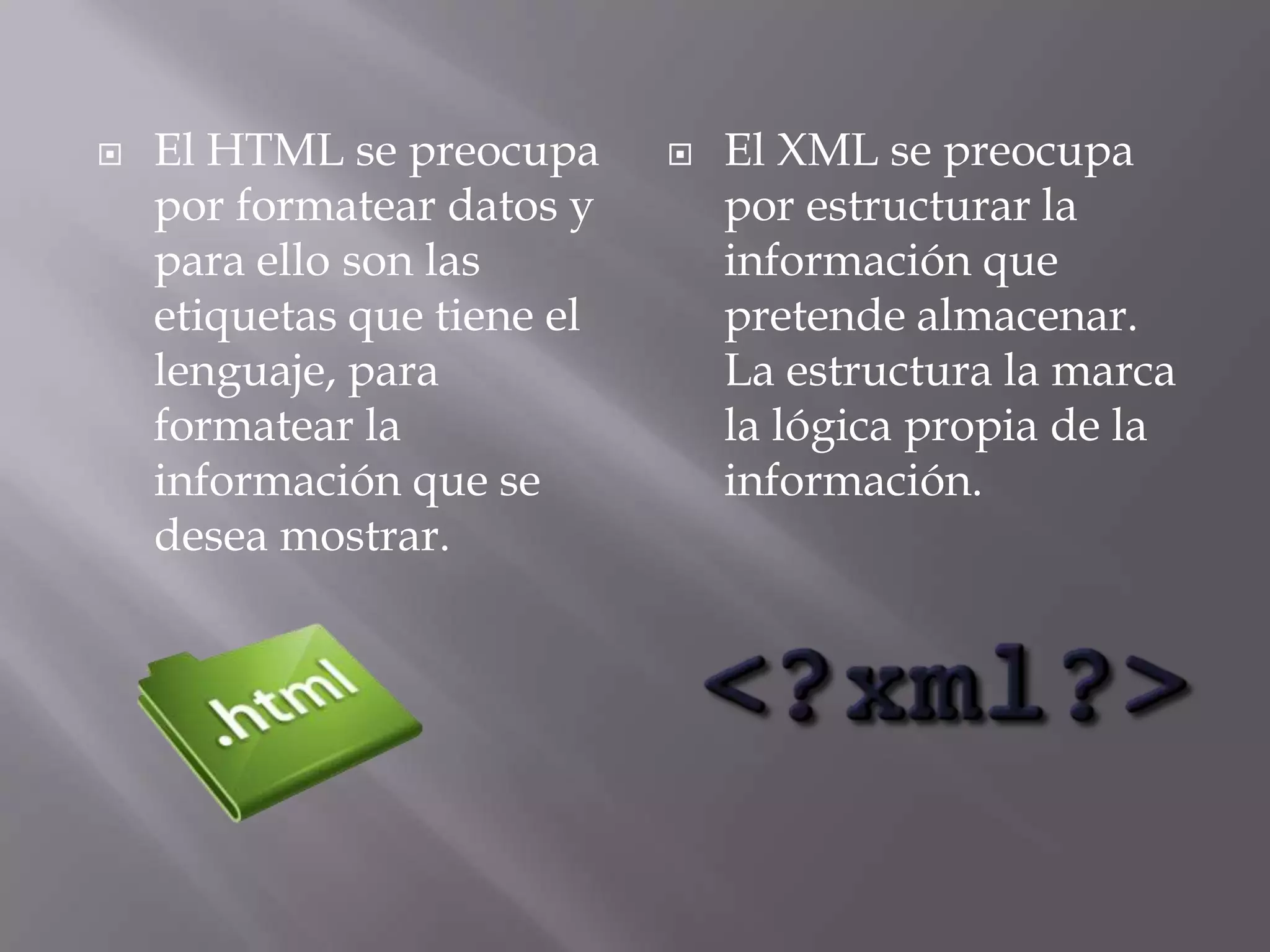El documento compara y contrasta HTML y XML. HTML se enfoca en dar formato a la información usando etiquetas, mientras que XML se enfoca en estructurar lógicamente la información. Aunque ambos nacieron del mismo origen, HTML es para mostrar información y darle formato, mientras que XML es para describir y organizar información de manera portable e independiente del formato. El XHTML intenta combinar las ventajas de ambos lenguajes siguiendo estrictamente los estándares.