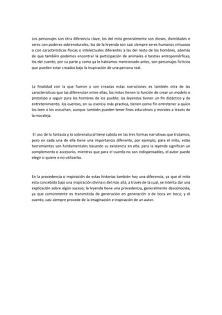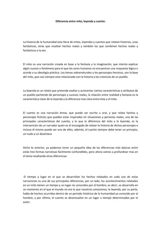 El documento explica las diferencias entre mito, leyenda y cuento. Los mitos intentan explicar sucesos sobrenaturales y se desarrollan en tiempos y lugares desconocidos, con dioses y seres sobrenaturales como personajes. Las leyendas combinan hechos reales y fantasía, y se desarrollan en períodos históricos conocidos, con personajes humanos virtuosos o diferentes. Los cuentos tienen personajes y lugares ficticios creados por un autor para entretener, aunque a veces también enseñan lecciones