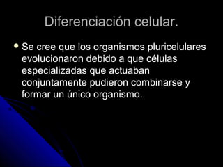 El documento describe el proceso de diferenciación celular en organismos pluricelulares. Señala que las células especializadas se combinan para formar tejidos que a su vez forman órganos. Explica que la diferenciación aumenta la eficiencia celular mediante la especialización y división del trabajo entre células, aunque también las hace dependientes entre sí. Finalmente, indica que la diferenciación está controlada por factores intrínsecos y extrínsecos a la célula.