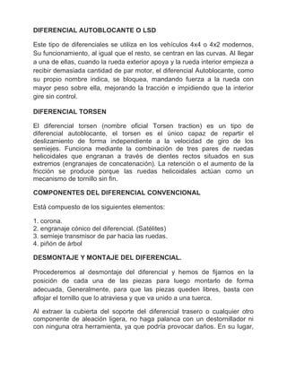 El documento describe las funciones y tipos de diferenciales. Un diferencial reduce la velocidad de rotación de la transmisión e incrementa la fuerza, distribuyendo el movimiento a las ruedas izquierda y derecha. Existen tres tipos principales de diferenciales: abierto, autoblocante y Torsen. Un diferencial abierto distribuye la fuerza por igual a ambas ruedas, mientras que los autoblocantes y Torsen pueden bloquearse para enviar más fuerza a la rueda con más tracción.