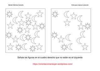 El documento contiene una serie de fichas para mejorar la atención en niños. Las fichas incluyen actividades como señalar las diferencias entre figuras en cuadros izquierdo y derecho, encontrar un número especificado de diferencias y colorear las figuras, e indicar qué figuras faltan en el lado derecho. El objetivo es desarrollar y fortalecer las habilidades de atención y concentración de los niños a través de ejercicios visuales.