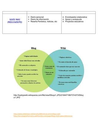 Este documento compara blogs y wikis, destacando sus diferencias en términos de autoría, estructura y propósito. Los blogs generalmente tienen un solo autor y se centran en el tiempo, mientras que las wikis permiten la colaboración colectiva y se centran en temas. Los blogs suelen usarse para diarios personales o noticias, mientras que las wikis se usan comúnmente para enciclopedias colaborativas, proyectos educativos y grupos de apoyo.