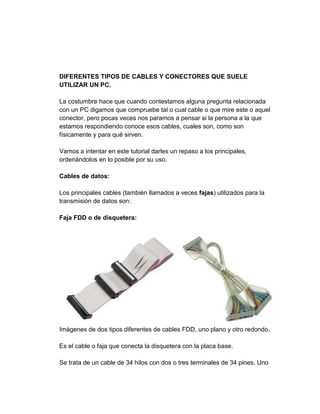 Este documento describe los diferentes tipos de cables y conectores utilizados en una computadora personal. Explica cables de datos como IDE, SATA y USB; cables de audio, video y red; y conectores eléctricos como ATX y Molex. Proporciona detalles sobre la función y especificaciones técnicas de cada tipo de cable y conector.