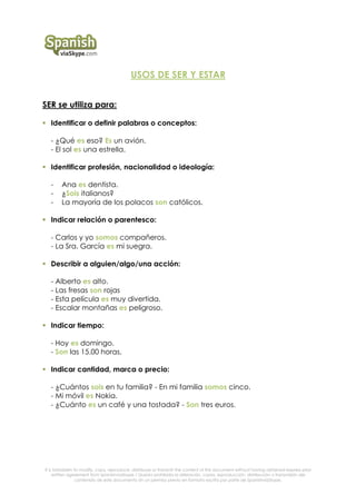 Este documento explica las diferencias entre los verbos "ser" y "estar" en español. "Ser" se usa para identificar, describir cualidades permanentes, indicar el origen, la profesión u otras características fijas. "Estar" se usa para indicar ubicaciones, estados temporales o de ánimo, y otras cualidades que pueden cambiar.