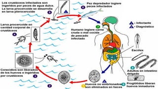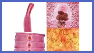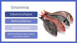 Este documento describe la difilobotriasis, una enfermedad causada por el parásito Diphyllobothrium latum. D. latum es un cestodo que puede medir más de 10 metros de largo y vive en el intestino delgado de humanos y otros mamíferos. Se transmite al consumir pescado crudo o poco cocinado que contiene larvas del parásito. Los síntomas pueden incluir diarrea, fatiga y anemia, aunque a menudo es asintomática. El diagnóstico se realiza identificando los hue