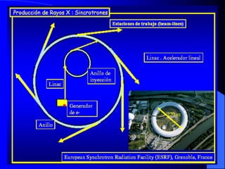 El documento resume la historia y los métodos de la difracción de neutrones. Explica que los neutrones se producen en reactores nucleares o fuentes de espalación y que pueden usarse para estudiar la estructura atómica de los sólidos y líquidos mediante difracción. También describe los componentes clave de un difractómetro de neutrones como el monocromador, colimadores y detector, y cómo se usa para obtener datos de difracción.