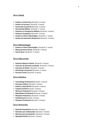 El documento presenta una lista de cursos de capacitación e iniciaciòn profesional organizados por área temática, con sus respectivas duraciones. Se detallan cursos de administración, derecho, diseño, hotelería y turismo, salud, odontología, educación, estética, nutrición, iniciación profesional, gestión y liderazgo, técnicas de estudio y veterinaria, con duraciones que van desde los 2 a los 6 meses.