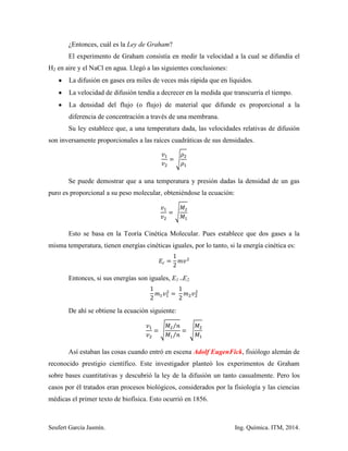 Este documento explora la relación entre la Ley de Graham y la Ley de Fick sobre la difusión. Ambas leyes describen la difusión, pero de maneras diferentes. La Ley de Graham establece que las velocidades de difusión son inversamente proporcionales a las raíces cuadradas de las densidades de los gases, mientras que la Ley de Fick postula que el flujo de difusión es proporcional al gradiente de concentración. Aunque las leyes matemáticamente no están directamente relacionadas, la Ley de Fick se basó en los experiment