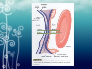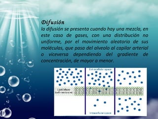 La difusión ocurre cuando hay una mezcla no uniforme de gases, como entre los alvéolos y los capilares sanguíneos. La presión de un gas depende del movimiento y choque de sus moléculas, y la presión parcial de un gas depende de su concentración y solubilidad. La velocidad de difusión depende de factores como la diferencia de presiones, solubilidad, área, distancia y grosor de la membrana.