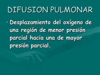 El documento describe los conceptos de difusión pulmonar, la ley de Fick que rige la difusión, y los métodos para medir la capacidad de difusión pulmonar del monóxido de carbono y el oxígeno. Explica que la capacidad de difusión pulmonar del CO se mide exhalando el CO absorbido, y que este valor se multiplica por 1.23 para obtener la capacidad de difusión del O2. También proporciona valores normales de capacidad de difusión del O2 y CO2 en reposo y durante el ejercicio