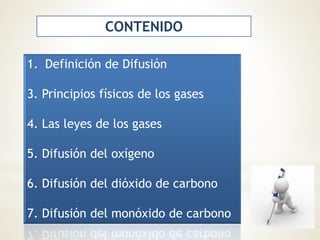 Este documento trata sobre la difusión de gases en el sistema respiratorio. Explica los principios físicos de los gases, las leyes que rigen la difusión como las leyes de Boyle, Dalton, Henry y Graham. Describe el proceso de difusión de oxígeno y dióxido de carbono a través de la membrana alveolo-capilar y su transporte en la sangre. Finalmente, analiza los factores que afectan la difusión como la solubilidad, peso molecular y gradientes de presión de los diferentes gases.