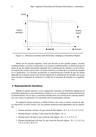 El documento introduce la electrónica digital, explicando que trabaja con variables discretas en lugar de continuas. Describe la diferencia entre circuitos combinacionales, cuyas salidas dependen solo de las entradas actuales, y circuitos secuenciales, cuyas salidas también dependen del estado previo. Finalmente, explica los sistemas numéricos binario, octal y hexadecimal usados en electrónica digital y cómo convertir entre ellos.