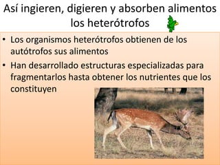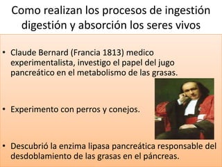 El documento describe los procesos de ingestión, digestión y absorción en diferentes organismos. Claude Bernard descubrió la enzima lipasa pancreática responsable de digerir las grasas. Los heterótrofos obtienen alimento de otros seres vivos y han desarrollado estructuras para digerirlos. Las bacterias, protozoos, hongos, plantas carnívoras e invertebrados digieren de forma extra e intracelular. Los vertebrados usan dientes, picos y ácidos gástricos para digerir en la boca, estómago e intest