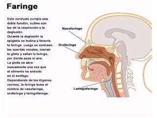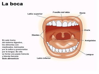 El documento habla sobre el sistema digestivo humano. Explica que el sistema digestivo está compuesto por el tubo digestivo y glándulas anexas que transforman los alimentos en sustancias solubles a través de procesos químicos y mecánicos para que puedan ser asimiladas por los tejidos. Describe las etapas de ingestión, digestión, absorción y egestión. Además, detalla algunos órganos como la boca, lengua, esófago y glándulas salivales involucrados en el proceso de digestión.