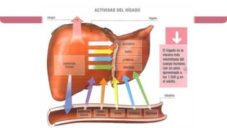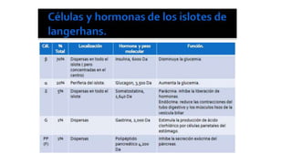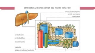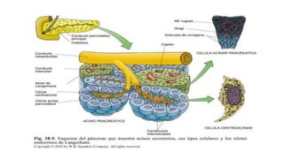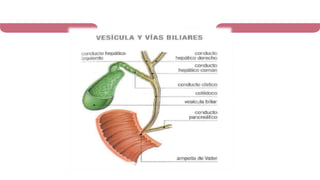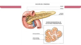 El documento proporciona información sobre el sistema digestivo, incluidas las glándulas salivales, el páncreas, el hígado y la vesícula biliar. Describe la función y características de cada órgano. Las glándulas salivales secretan saliva para iniciar la digestión. El páncreas secreta enzimas y hormonas. El hígado produce bilis y desempeña un papel importante en el metabolismo. La vesícula biliar almacena y libera bilis para ayudar a digerir la grasa.