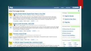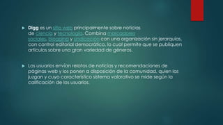 Digg es un sitio web que permite a los usuarios publicar y votar artículos de noticias sobre ciencia y tecnología. Los usuarios pueden enviar enlaces a artículos y páginas web, y la comunidad puede votarlos y comentarlos. Los artículos con más votos aparecen en la portada del sitio. Aunque Digg tuvo problemas en el pasado, ha cambiado su funcionalidad y ahora ofrece una plataforma gratuita para que los usuarios compartan y descubran nuevo contenido relevante.