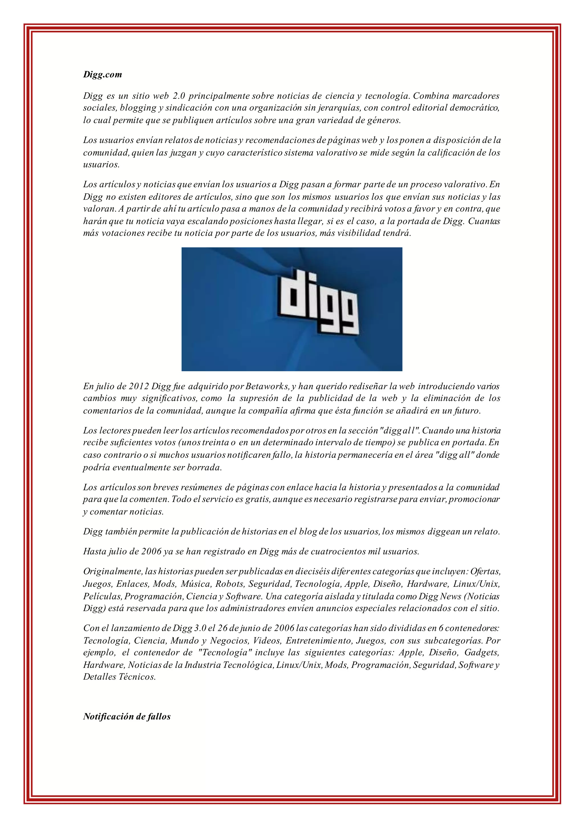 Digg es un sitio web que permite a los usuarios enviar y valorar artículos de noticias. Los usuarios envían enlaces a artículos y la comunidad los vota, determinando qué artículos aparecen en la portada. No hay editores, sino que la comunidad controla el contenido a través de la votación. Digg ha crecido rápidamente y puede generar grandes cantidades de tráfico hacia los sitios vinculados cuando un artículo se vuelve popular.