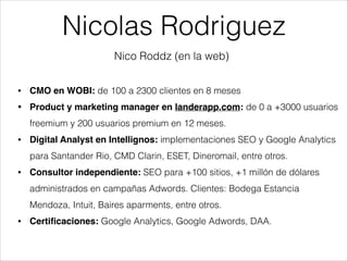 Nicolas Rodriguez presenta su experiencia en marketing digital y análisis de datos. Ha trabajado como CMO, product manager y analista digital para varias empresas. Está certificado en Google Analytics, Adwords y DAA. Ofrece seminarios sobre análisis digital y consultoría independiente enfocada en SEO y campañas de Adwords.