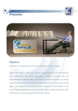 El documento describe 'digital file', un sistema diseñado para gestionar y almacenar documentos de manera eficiente y segura, reduciendo costos de almacenamiento y tiempo de búsqueda. Este sistema mejora la calidad de conservación de los documentos digitales, evita el maltrato y la pérdida de información, y permite un control de acceso robusto. Además, su uso facilita la administración de información y proporciona un entorno amigable similar al de una página web.