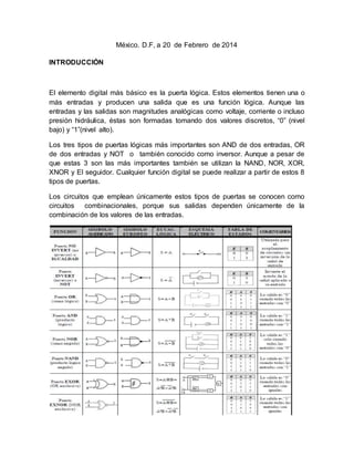 Este documento presenta una práctica de laboratorio sobre puertas lógicas. Describe los objetivos, el desarrollo y los resultados de la práctica, la cual incluyó verificar las tablas de verdad de puertas lógicas básicas como AND, OR e inversor usando un protoboard y LEDs, y comprobar el teorema de De Morgan. Se proporcionan diagramas de circuitos realizados y materiales utilizados. Las conclusiones indican que se logró comprobar el funcionamiento de las puertas lógicas y los