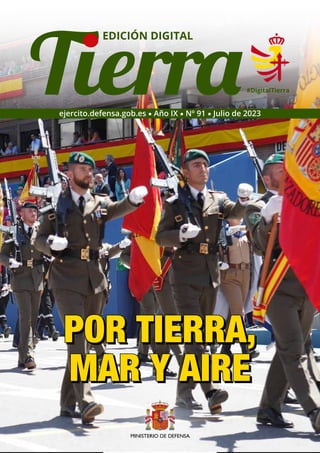 La edición de julio de 2023 de la revista 'Tierra Digital' destaca el desfile del Día de las Fuerzas Armadas celebrado en Granada, donde participaron más de 3,000 militares y diversos vehículos y aeronaves. Además, se aborda la evolución y entrenamiento del grupo táctico 'Colón', ubicado en Albacete, que se prepara para cumplir con los objetivos del proyecto Ejército 2035 mediante ejercicios de combate en entornos complejos. También se conmemoran hitos significativos como el 35º aniversario del ingreso de la mujer en las fuerzas armadas y diversos eventos establecidos para acercar el trabajo militar a la sociedad.