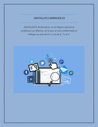Este documento resume la página web de la profesora Luz Marina, la cual muestra el trabajo de sus estudiantes de los grados 6to, 7mo y 8vo. La página incluye secciones de bienvenida, una descripción general de los grados 6to y 8vo, información sobre la clase de tecnología e informática para 8vo grado en el primer periodo, la trayectoria profesional de la maestra y los recursos utilizados en la página.