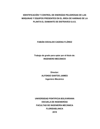 Este proyecto de grado tiene como objetivo apoyar el plan de control de energías peligrosas de la planta industrial Distraves S.A.S. mediante la creación de documentos como hallazgos, inventarios y fichas de bloqueo/etiquetado según normas nacionales e internacionales. El autor trabajó con ingenieros y coordinadores para identificar riesgos en maquinaria y equipos, y proponer medidas que prevengan accidentes laborales contribuyendo a la seguridad ocupacional en la organización avícola.
