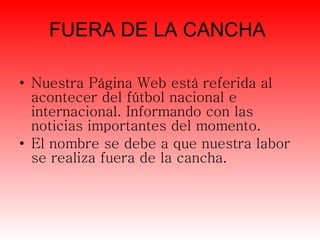 El documento presenta una página web llamada "Fuera de la Cancha" que informa sobre noticias de fútbol nacional e internacional. La página está dirigida a amantes del fútbol entre 13 y 55 años y contiene secciones sobre fútbol peruano, internacional, la selección peruana y peruanos en el exterior. El diseño utiliza colores verde y negro y fuentes Geneva, Verdana y Arial. La estrategia es posicionarse como un sitio especializado solo en fútbol para que los usuarios encuentren rápid