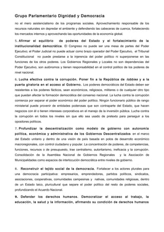 Este documento presenta una declaración de principios políticos de un grupo parlamentario peruano llamado Dignidad y Democracia. El grupo busca promover la coherencia entre lo que los políticos dicen y hacen, respetar los valores históricos del país como la dignidad y la democracia, y priorizar la atención a problemas nacionales como el apoyo al agro, la formalización minera, y los derechos laborales. También busca fortalecer la descentralización, combatir la corrupción, y defender los derechos humanos