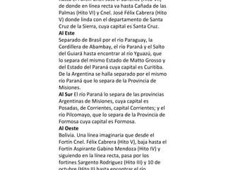 El documento presenta información sobre la geografía, economía y datos generales de Paraguay. Paraguay limita con Argentina, Bolivia y Brasil y está dividido en dos regiones separadas por el Río Paraguay. Su economía se basa principalmente en la agricultura y la ganadería, aunque también tiene una industria limitada de procesamiento de productos agrícolas. Paraguay experimentó un fuerte crecimiento económico en 2010 pero sufrió una contracción en 2012.