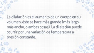 La dilatación es el aumento del volumen de un cuerpo debido a variaciones de temperatura a presión constante, y se clasifica en lineal, superficial y volumétrica. La dilatación lineal afecta el tamaño de objetos en un solo sentido, la superficial se observa en placas metálicas, y la volumétrica se aplica a líquidos, utilizando diferentes fórmulas. La dilatación es directamente proporcional a la variación de temperatura.