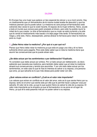 Este documento presenta el dilema de Heinz, cuyo esposa está muriendo de cáncer y solo un nuevo medicamento descubierto por un farmacéutico puede salvarla. Sin embargo, el medicamento es muy caro y Heinz solo ha podido reunir la mitad del costo. Al negarse el farmacéutico a venderlo más barato o dejar pagar después, Heinz considera robar el medicamento de la farmacia para salvar a su esposa.