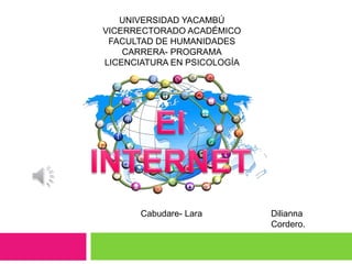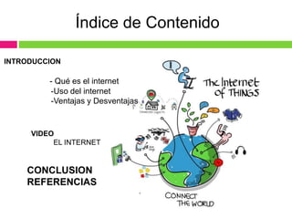 El documento describe el origen e historia de Internet, sus usos principales como medio de comunicación, ocio y fuente de información, así como sus ventajas como facilitar la comunicación y búsqueda de información y sus desventajas como la dependencia, proliferación de malware y dificultad para realizar tareas sin conexión. Explica que Internet surgió en 1960 como red militar estadounidense y evolucionó a una red global de redes con la creación de la World Wide Web en 1993, revolucionando la distribución y acceso a la información.