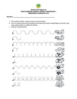 Este documento contiene varias páginas de actividades para estudiantes de transición 1 en el Instituto Pablo VI. Las actividades incluyen trazar líneas, colorear imágenes, aprender el abecedario, practicar vocabulario en inglés como colores, frutas y útiles escolares. Se proporcionan enlaces de videos para apoyar el aprendizaje.