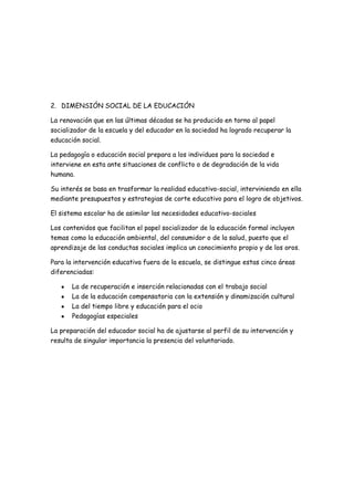 El documento describe las cuatro dimensiones de la educación: 1) La dimensión moral busca capacitar a las personas para tomar decisiones responsables y autónomas basadas en valores. 2) La dimensión social prepara a los individuos para la sociedad e interviene en situaciones de conflicto mediante estrategias educativas. 3) La dimensión económica reconoce que una persona educada produce más, lo que aumentó los presupuestos educativos. 4) La dimensión política vincula la educación con el Estado y la vida pública para regular la organización escolar y producir