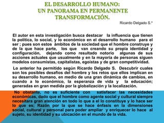 El autor busca destacar cómo lo político, social y económico influyen en el desarrollo humano, configurando la identidad del individuo. Analiza los desafíos actuales como la competitividad y el consumismo, y la necesidad de satisfacer las necesidades del ser humano más allá de lo económico, considerando también lo social, cultural y personal. Resalta la importancia de articular estas diferentes dimensiones para un pleno desarrollo humano.