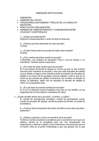 La maestra Cristina Hernández se describe a sí misma y su trayectoria profesional de 26 años como educadora preescolar. También describe la escuela donde trabaja, incluyendo detalles sobre el personal docente, apoyo recibido, eventos y comités. Finalmente, discute sus enfoques para fomentar valores, relacionarse con estudiantes y padres, y usar estrategias didácticas en el salón de clases.