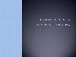 El documento describe las seis dimensiones de la práctica docente: personal, interpersonal, social, institucional, didáctica y valoral. La práctica docente implica múltiples relaciones entre maestros, alumnos e instituciones educativas. Cada maestro analiza su práctica considerando su contexto histórico y entorno particular para recrear el conocimiento de manera acorde a sus valores personales.
