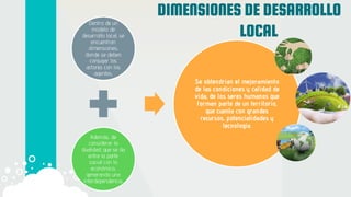 El desarrollo local se define como un proceso de cambio estructural en las economías locales, abarcando dimensiones económica, socio-cultural y político-administrativa, donde la interdependencia entre actores y recursos es esencial para mejorar la calidad de vida. Se enfatiza la importancia de la capacidad de las empresas locales para competir y la integración de valores y redes sociales en el desarrollo. Además, se destaca la necesidad de políticas coherentes y sostenibles que respondan a los retos actuales del desarrollo local y global.