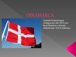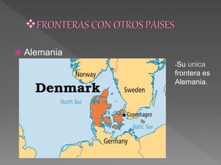 Dinamarca es un país ubicado en Europa del Norte. Limita solo con Alemania y está rodeado por el Mar Báltico y el Mar del Norte. Su clima es atlántico y continental. Sus principales ciudades son Copenhague, la capital, Aarhus y Aalborg. La moneda es la corona danesa y su líder actual es Helle Thorning. Dinamarca tiene una religión oficial protestante luterana y destaca por sus parques nacionales y fauna que incluye ciervos y venados.