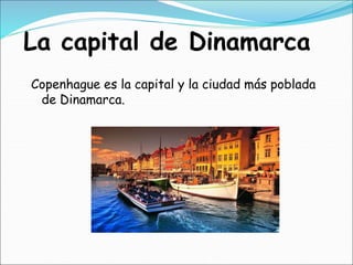 Copenhague es la capital y ciudad más poblada de Dinamarca, que tiene una población de aproximadamente 5.5 millones de personas. Dinamarca tiene una superficie de 43,094 km2 y su bandera roja con cruz blanca es considerada la bandera nacional más antigua del mundo. Algunos de los monumentos importantes son el Palacio de Christian IX y La Sirenita. Dinamarca se unió a la Unión Europea en 1973 y se encuentra en Europa del Norte.