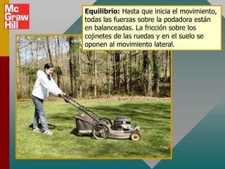 El documento trata sobre los conceptos de fricción estática y cinética. Explica que la fricción se opone al movimiento relativo entre dos superficies en contacto. Define los coeficientes de fricción estática y cinética, y establece que la fuerza de fricción es proporcional a la fuerza normal. También presenta ejemplos para ilustrar cómo aplicar los conceptos de fricción al análisis de problemas de equilibrio e iniciación del movimiento.