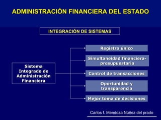 El documento describe el Sistema Integrado de Administración Financiera del Sector Público (SIAF-SP) de Perú. Explica que el SIAF-SP integra los sistemas de contabilidad, presupuesto, tesorería, deuda pública y contraloría para permitir la simultaneidad financiera-presupuestaria, el control de transacciones y una mejor toma de decisiones con oportunidad y transparencia. Además, presenta los principios y normas que rigen el Sistema Nacional de Contabilidad de Perú.