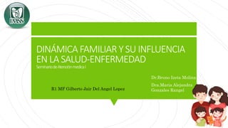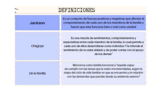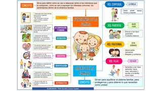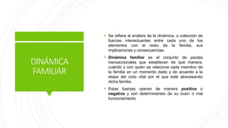 Este documento describe la dinámica familiar y su influencia en la salud y enfermedad. Explica conceptos como los roles familiares, la jerarquía, los límites y las alianzas. Indica que una familia funcional mantiene el equilibrio a través de las crisis resolviéndolas de forma que promueva el desarrollo de cada miembro.