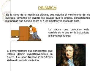 Este documento presenta conceptos básicos de dinámica como fuerza, masa, peso, inercia y las leyes de Newton. Explica que la dinámica estudia el movimiento de los cuerpos tomando en cuenta las fuerzas que actúan sobre ellos y su masa. Define fuerza, masa y peso y distingue entre ellos. Luego introduce las leyes fundamentales del movimiento propuestas por Isaac Newton: la primera ley establece que un cuerpo permanece en reposo o movimiento uniforme a menos que una fuerza actúe sobre él; la segunda ley rel