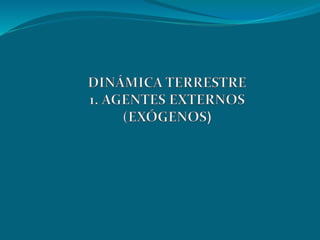 El documento aborda la dinámica terrestre del planeta Tierra, destacando los agentes atmosféricos, biológicos e hidrológicos que influyen en su equilibrio. También se mencionan los agentes internos como el vulcanismo y los seísmos, así como el impacto negativo de las acciones humanas sobre el medio ambiente. Se enfatiza la necesidad de tomar conciencia sobre el cuidado del planeta antes de que sea demasiado tarde.