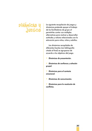 Este documento presenta varias dinámicas y juegos para grupos con el objetivo de fomentar la confianza, la comunicación y la resolución de conflictos. Incluye dinámicas de presentación, confianza grupal, contacto emocional, comunicación y resolución de conflictos. Algunas dinámicas populares son "Las velas encendidas" para la confianza grupal, "Los ciegos" para el contacto emocional, y juegos de roles para la resolución de conflictos. El documento provee instrucciones detalladas