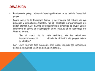 La dinámica de grupo se refiere al estudio de los procesos y estructuras grupales. Kurt Lewin fue el fundador de esta área y estableció que las relaciones dentro de un grupo mejoran con comunicaciones abiertas, confiadas y adecuadas entre los miembros. Las dinámicas de grupo son herramientas usadas para mantener la atención y participación en clase, y existen diferentes tipos como las de presentación, integración, organización de grupos y profundización.