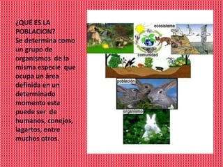 El documento presenta información sobre la dinámica de la población humana. Explica que la población se ve influenciada por factores como el clima, relieve, vegetación, hidrografía y suelo. También describe conceptos demográficos como natalidad, mortalidad, migración y crecimiento poblacional. Finalmente, analiza las características de las poblaciones rurales y urbanas.